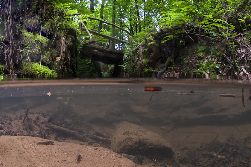 Lebensraum der Feuersalamader – Staubecken im Seltenbach mit Salamanderlarven auf dem Stein